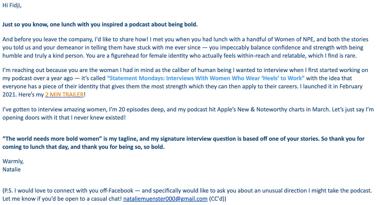 I emailed and got a response from one of my idols and inspiration for starting Statement Mondays: Fidji Simo (prior VP of Product @ Facebook, I emailed her just before she left!)
